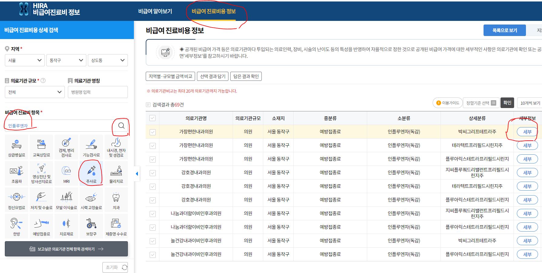 HIRA 싸이트로 접속 후 위쪽에 비급여 진료비용 정보를 클릭합니다. 왼쪽에 알아보실 지역을 설정하신 후 비급여 진료비 항목에 인플루엔자로 쓰고 주사를 선택 후 돋보기 모양을 클릭하시면 근처 병원 목록이 나옵니다. 병원 목록마다 오른쪽에 세부 버튼을 누르면 접종하는 제품과 금액을 알 수 있습니다.